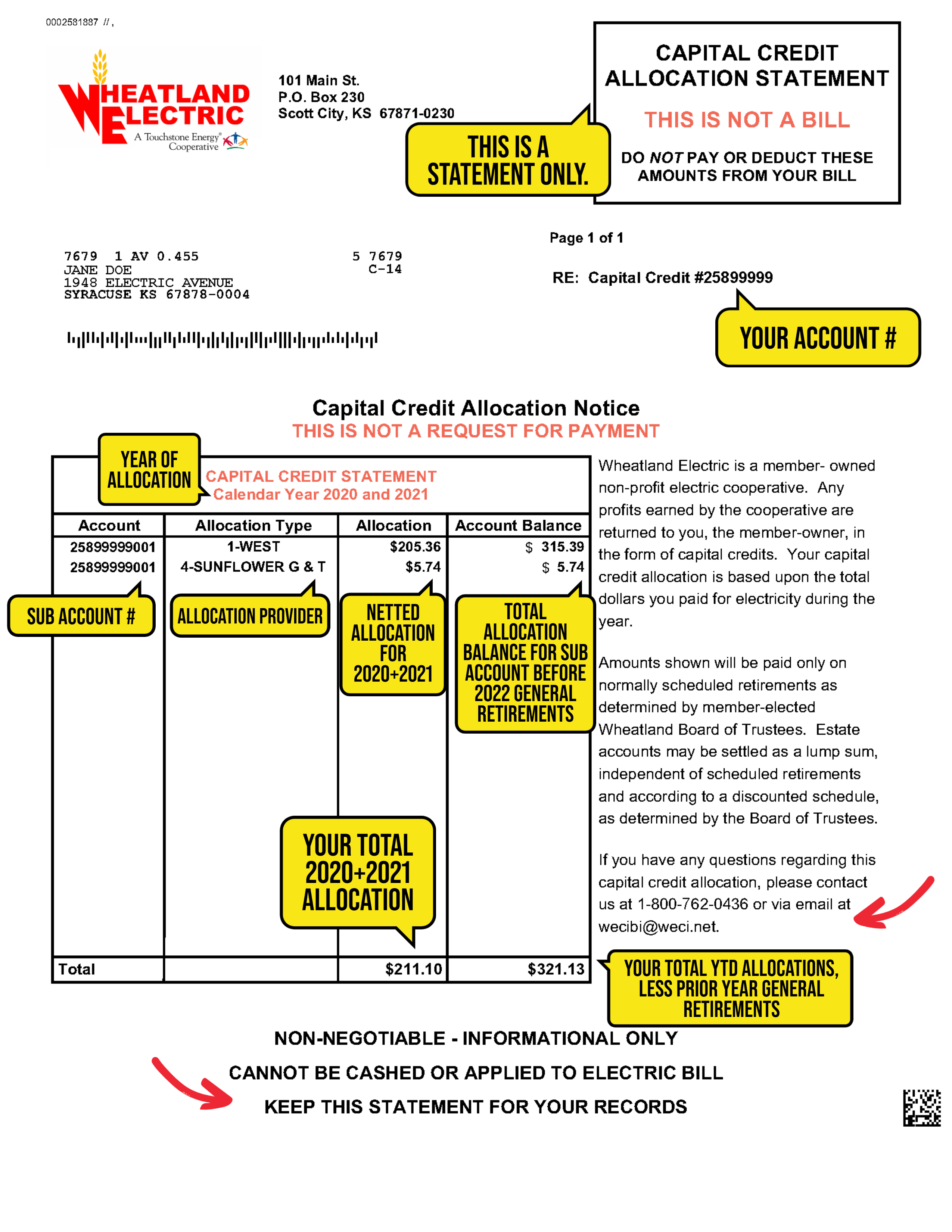 The statements, mailed Nov. 30, detail the “allocation” or amount of capital credits (in dollars) a member has been allocated in 2020 and 2021 (combined) and the source of these credits.