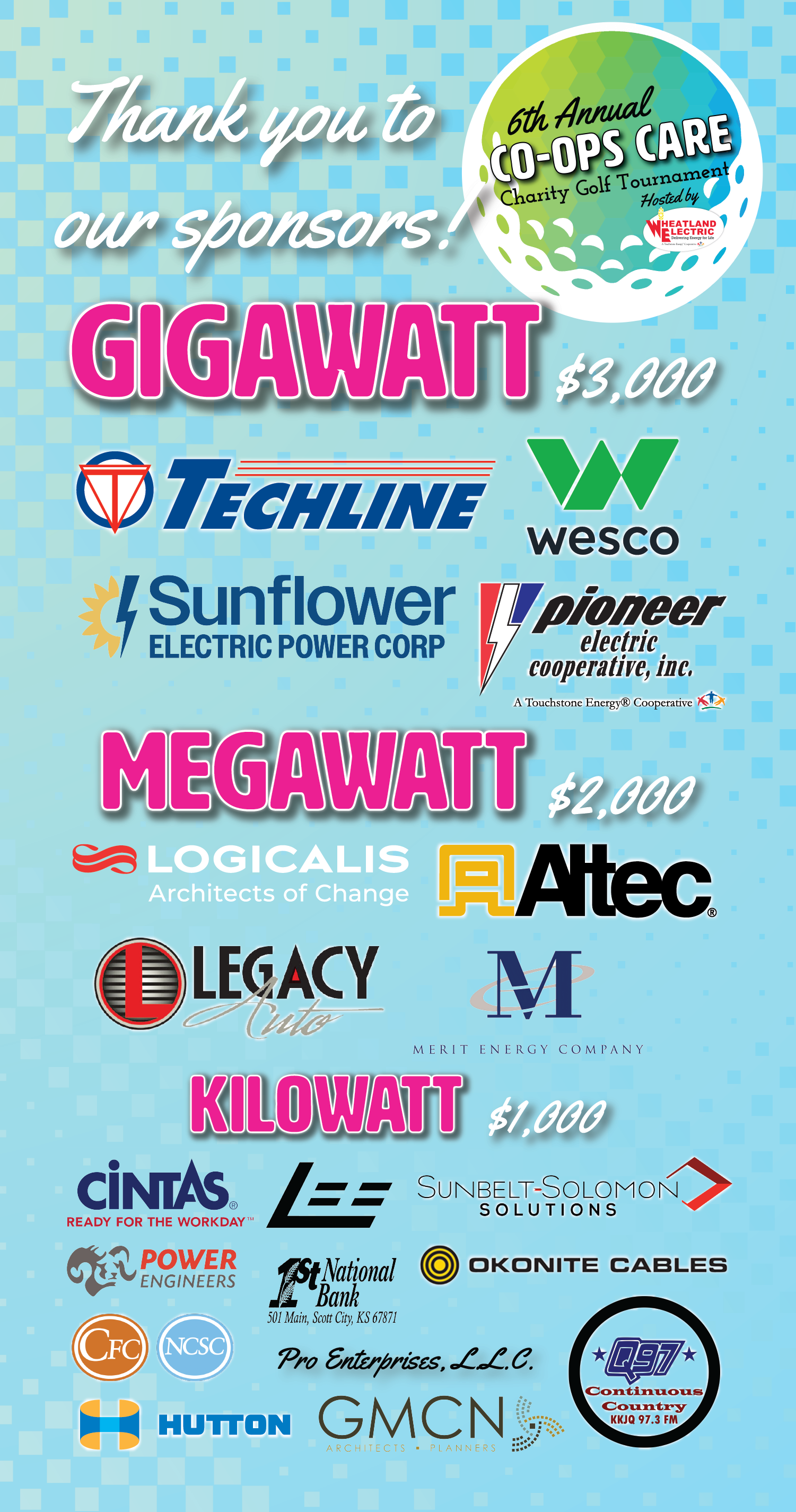 A special shoutout to this year’s GIGAWATT SPONSORS, including SUNFLOWER ELECTRIC POWER CORPORATION, PIONEER ELECTRIC COOPERATIVE, TECHLINE, and WESCO, which each contributed $3,000 to