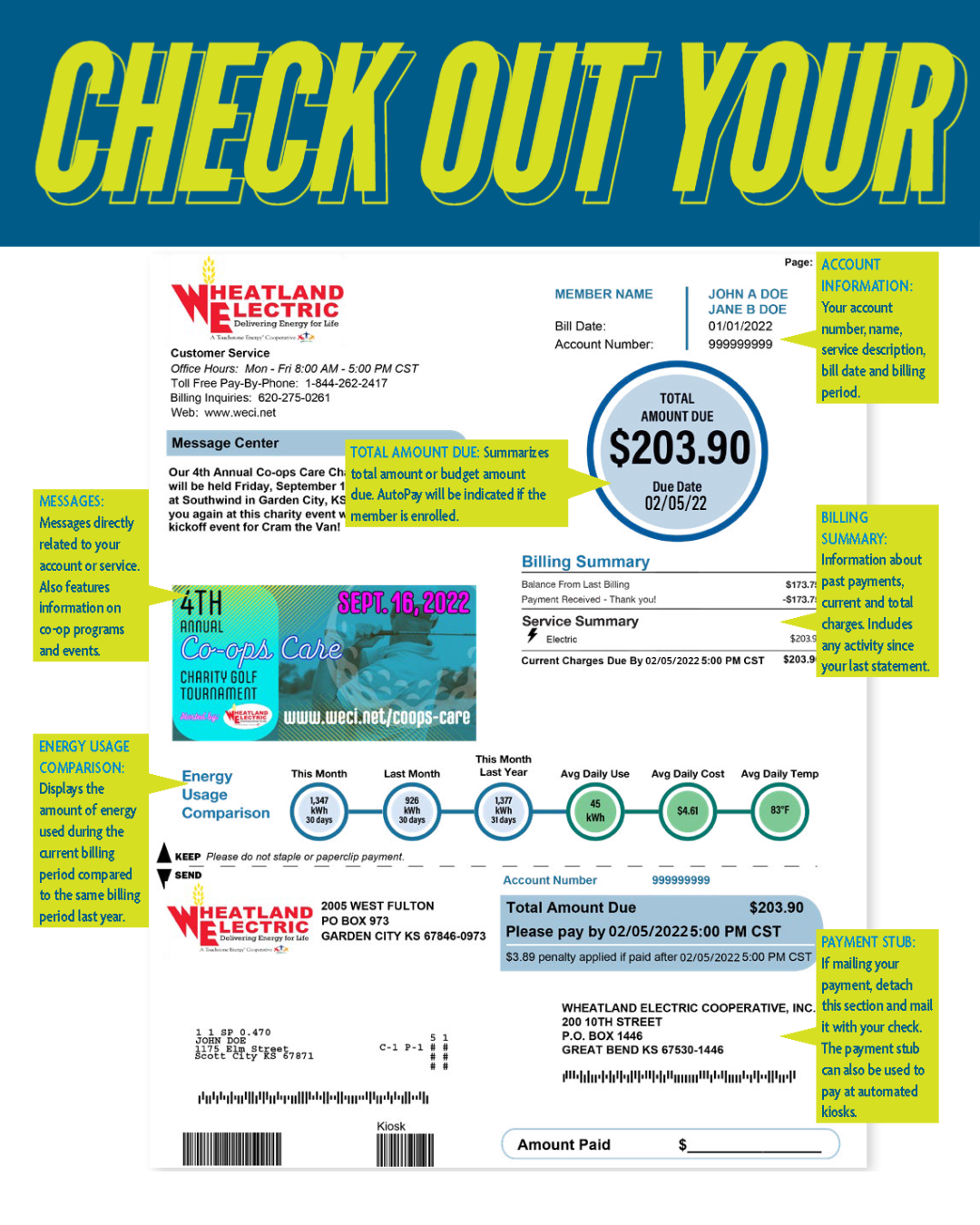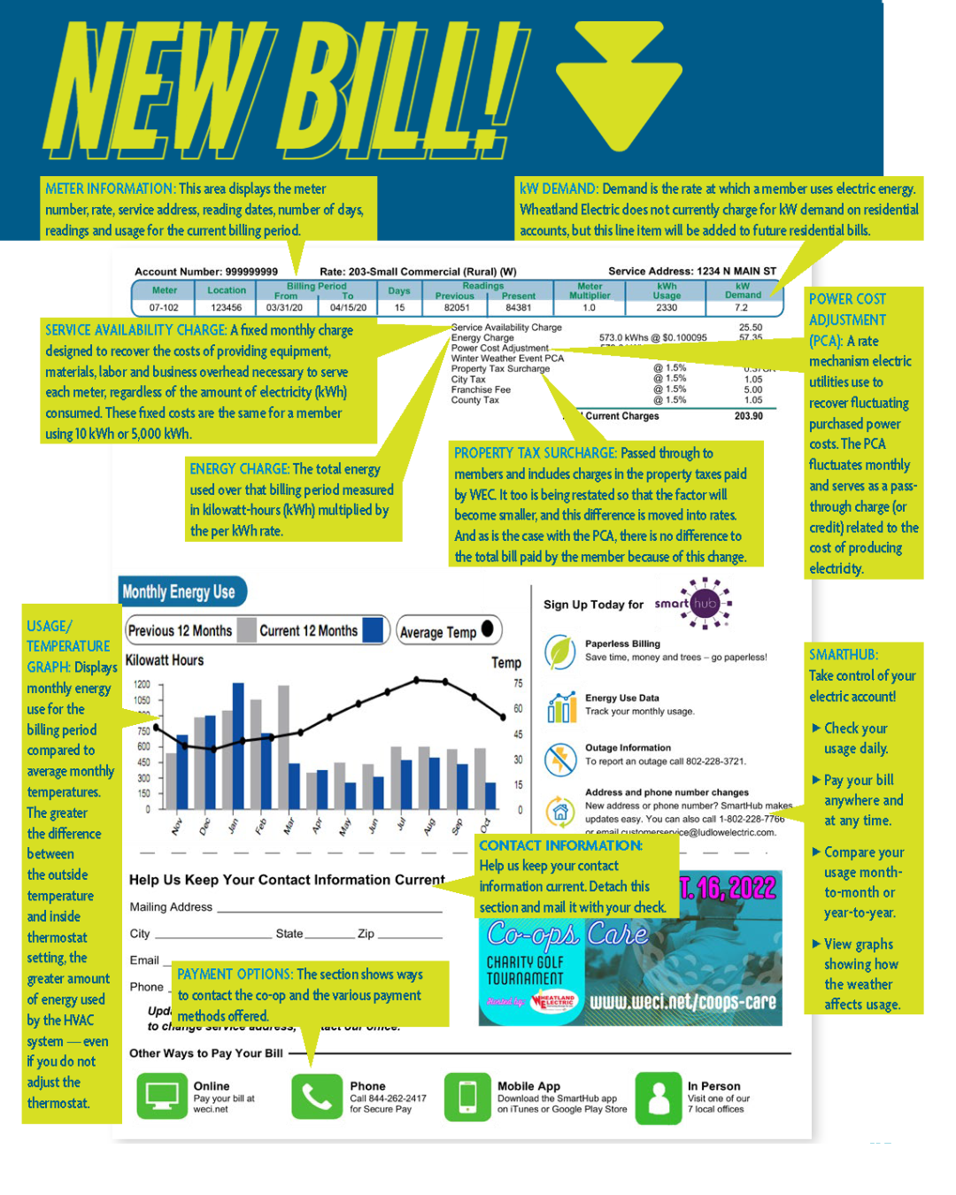 Wheatland Electric has re-designed our bills to give our members more information about their electrical usage and accounts. The bill will provide a detailed explanation of charges along with a message center that will contain important messages from WEC.
