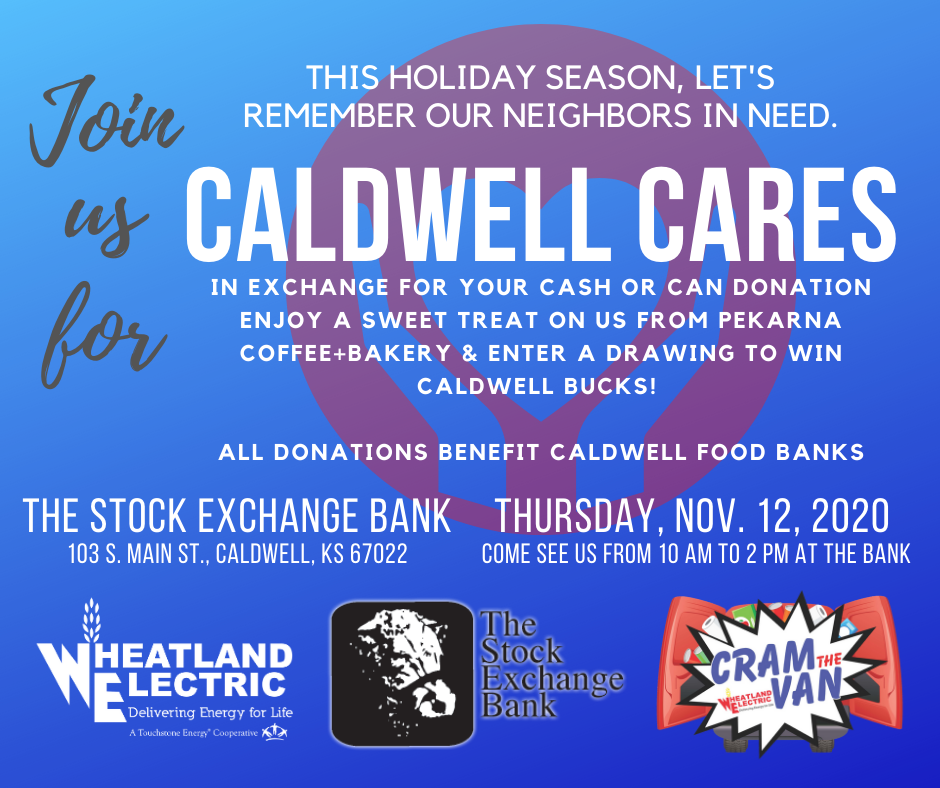 CALDWELL – Wheatland Electric Cooperative, Inc., is hosting Caldwell Cares on Thursday, Nov. 12, 2020, at Stock Exchange Bank, 103 S. Main St., to raise cash and canned food donations for local food banks ahead of the holiday season.