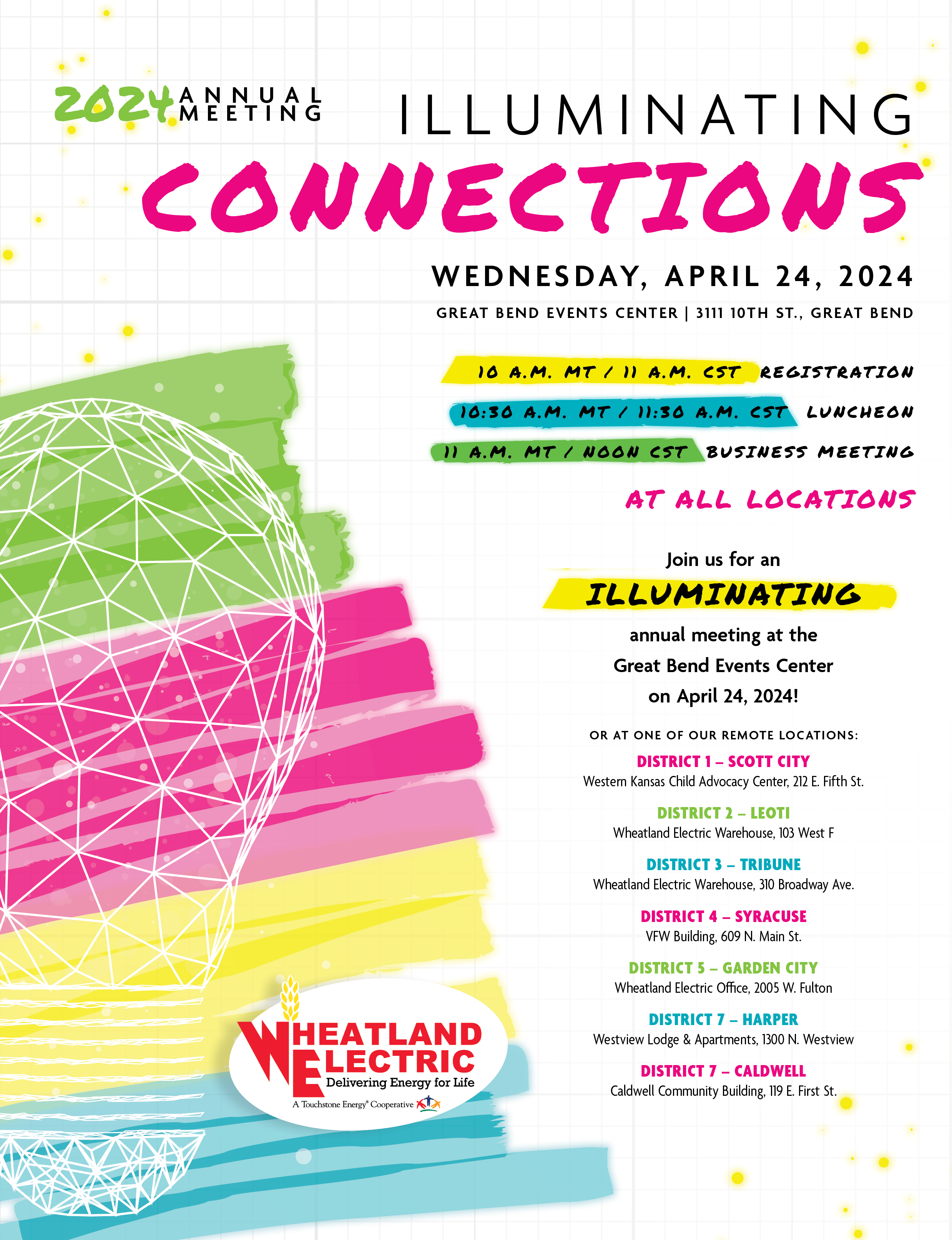 That’s why you should mark your calendar now for APRIL 24 for our 2024 ANNUAL MEETING, located this year in Great Bend and livestreamed to seven remote locations across our service territory: Scott City, Leoti, Tribune, Syracuse, Garden City, Harper and Caldwell.