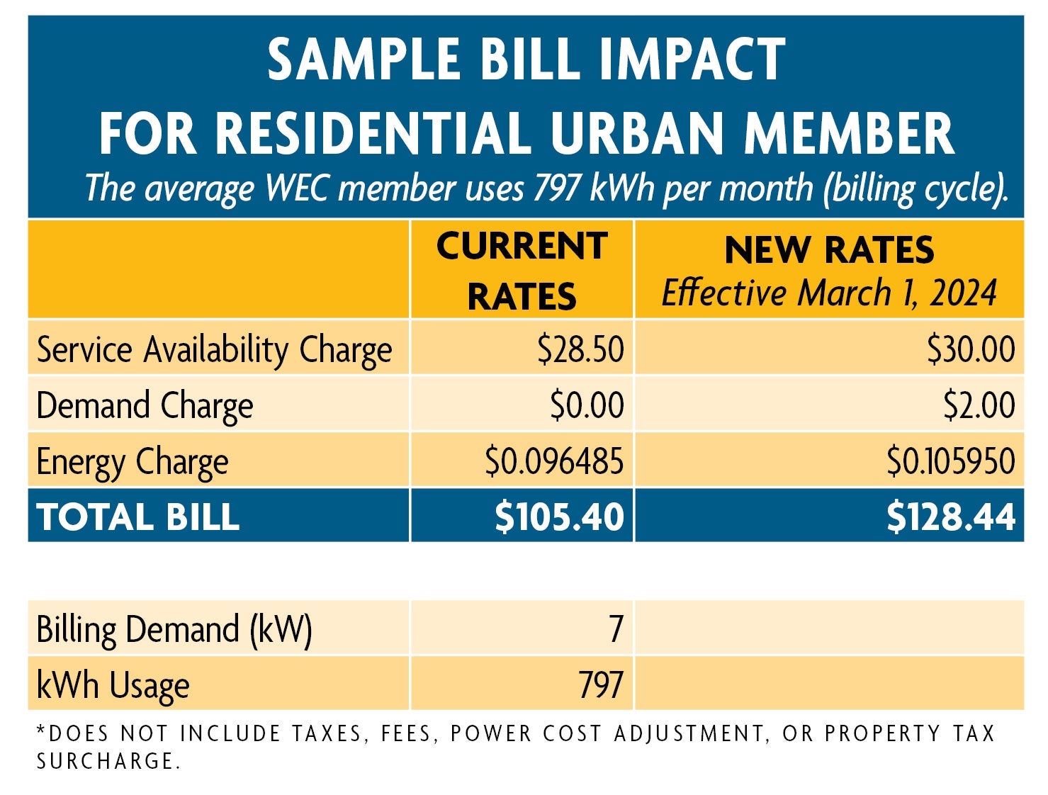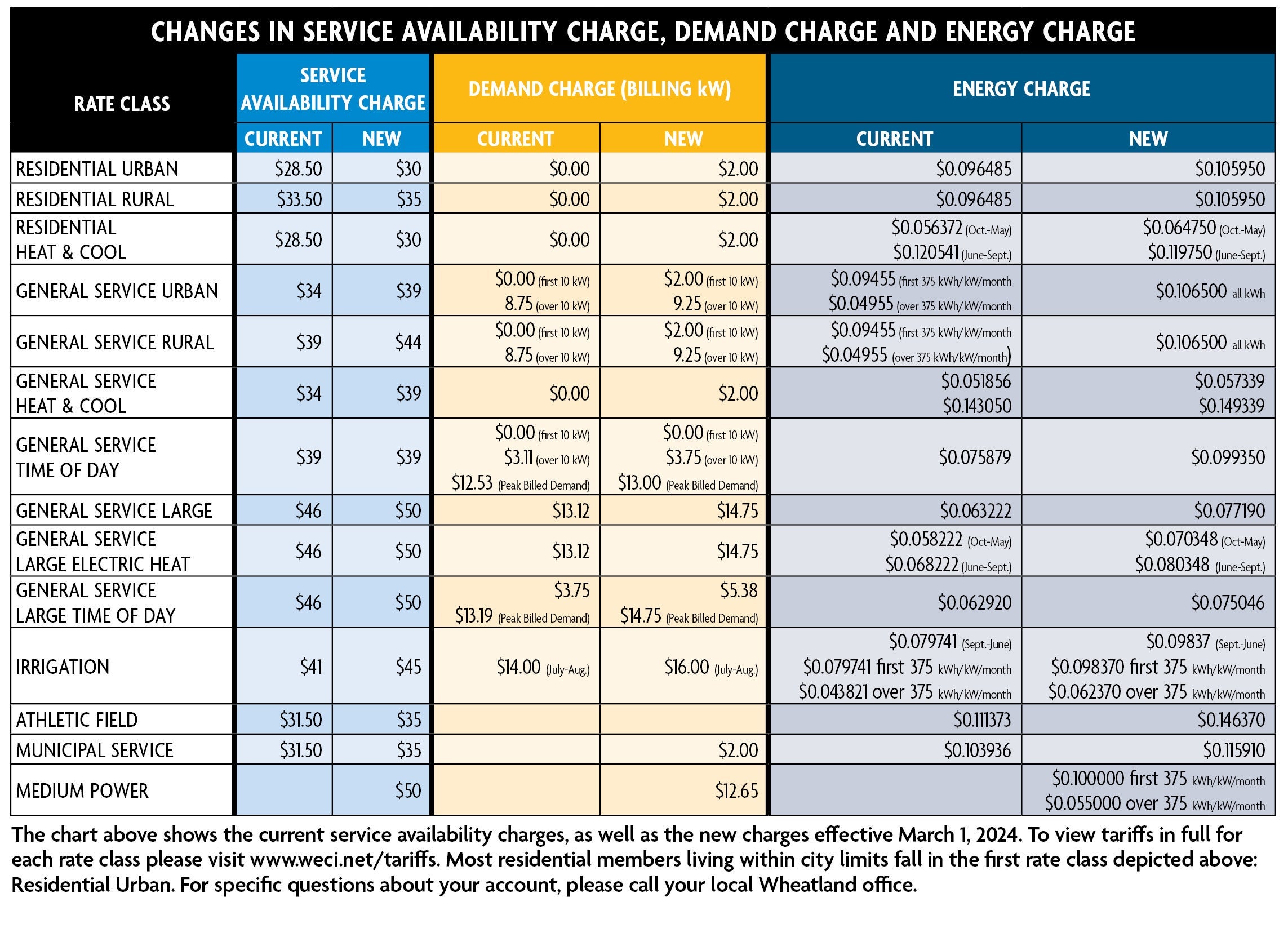 The chart above shows the current service availability charges, as well as the new charges effective March 1, 2024. To view tariffs in full for each rate class please visit www.weci.net/tariffs. Most residential members living within city limits fall in the first rate class depicted above: Residential Urban. For specific questions about your account, please call your local Wheatland office.