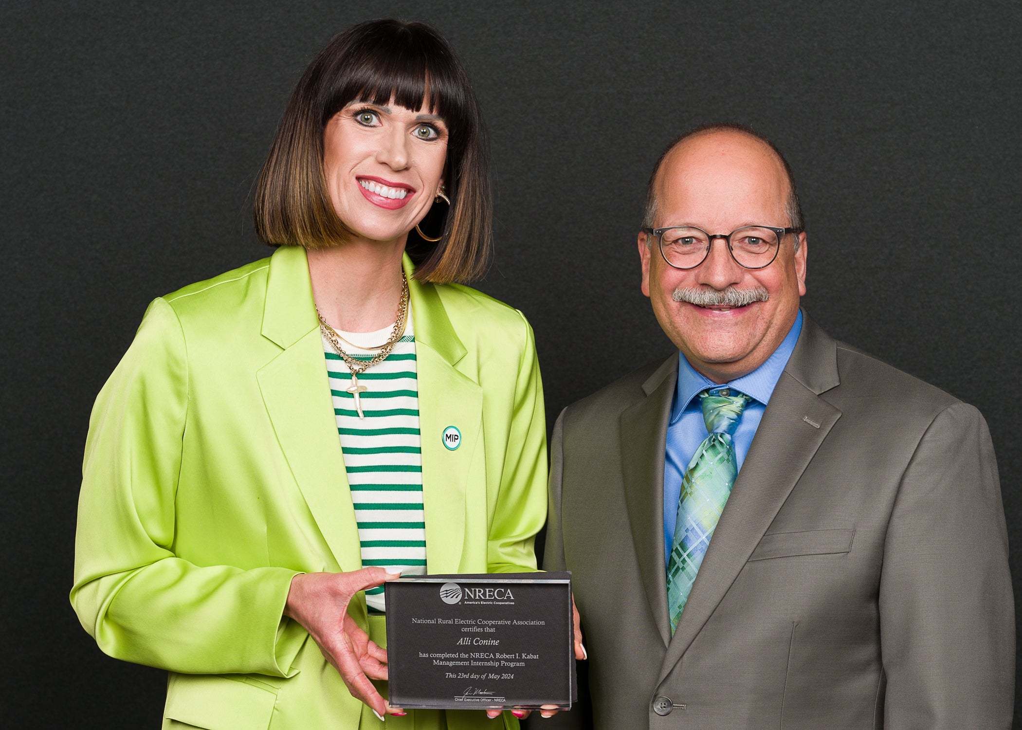 Alli Conine (left), WEC's director of member services and corporate communications, receives a plaque recognizing her completion of the Robert I. Kabat Management Internship Program from Gary Pfann, director of staffing and education at NRECA.