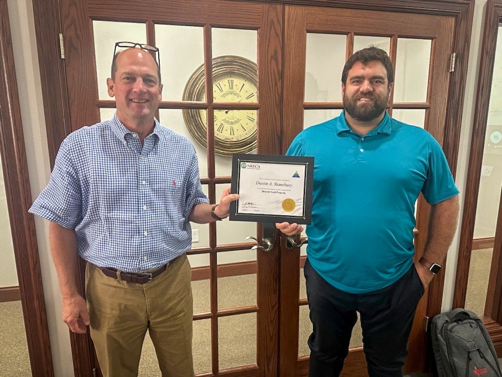 WEC Board President Mark Arnold (left) presents WEC Trustee Dustin Stansbury with his Director Gold Credential from NRECA.