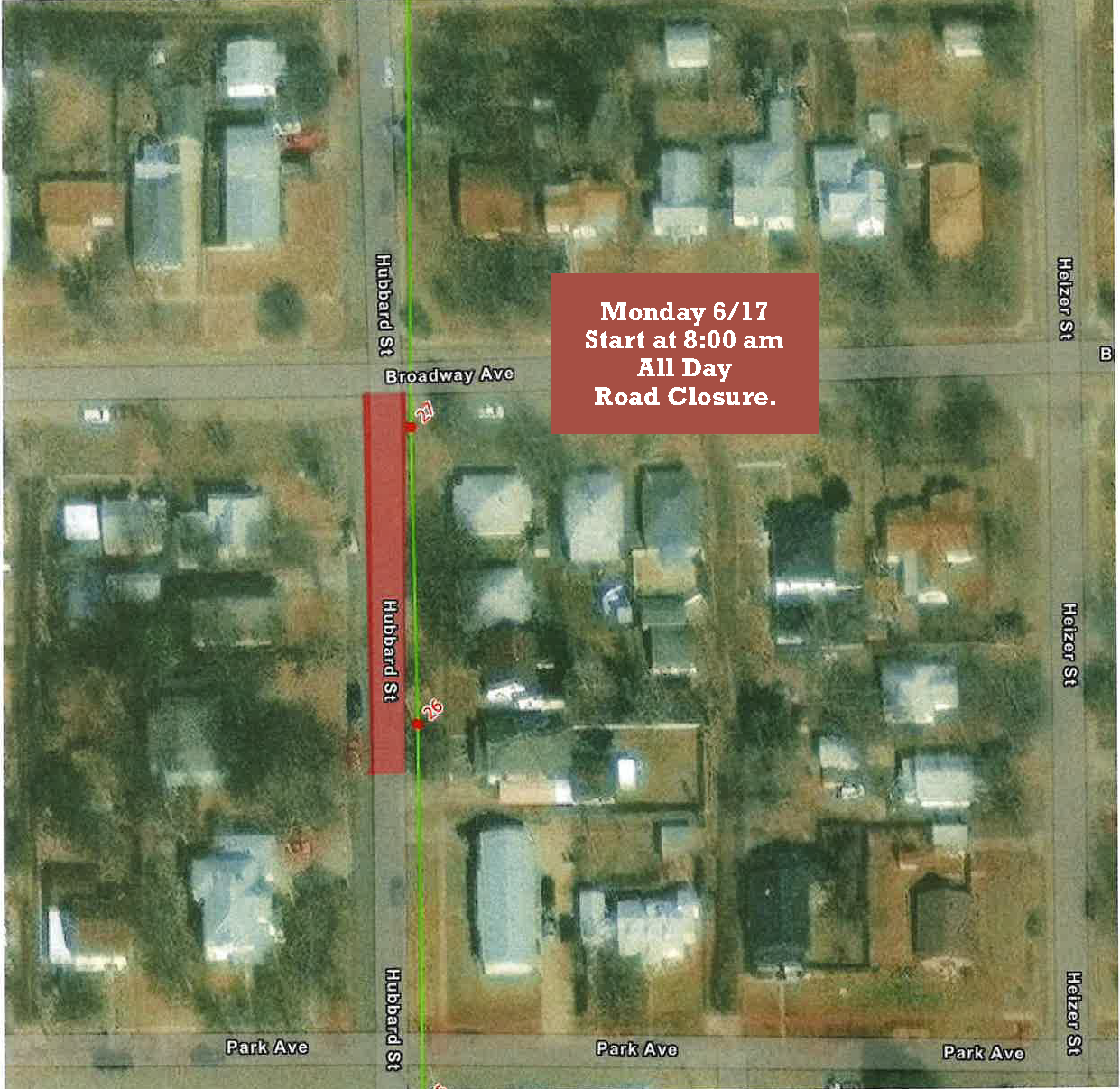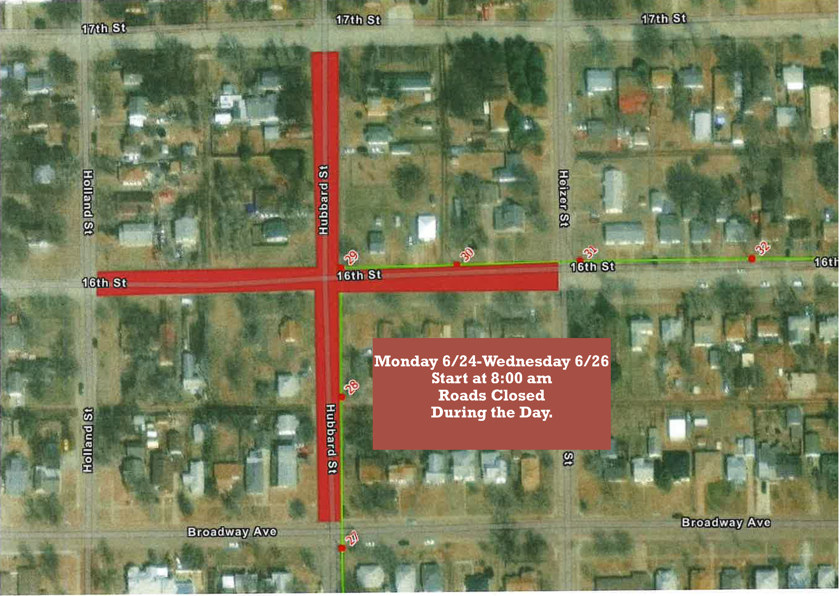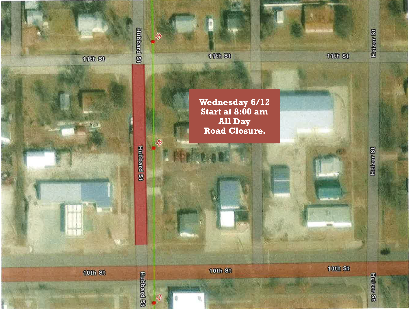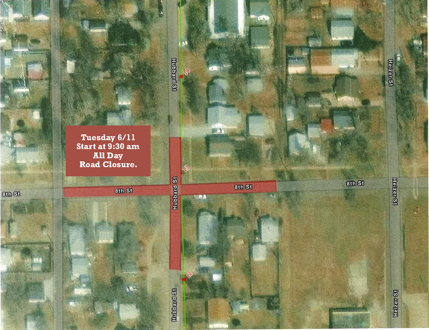 Work will begin around 9:30 AM CDT on Tuesday, June 11 at the intersection of 8th Street and Hubbard Street. Residents should expect a road closure in the area, detailed in the map below.
