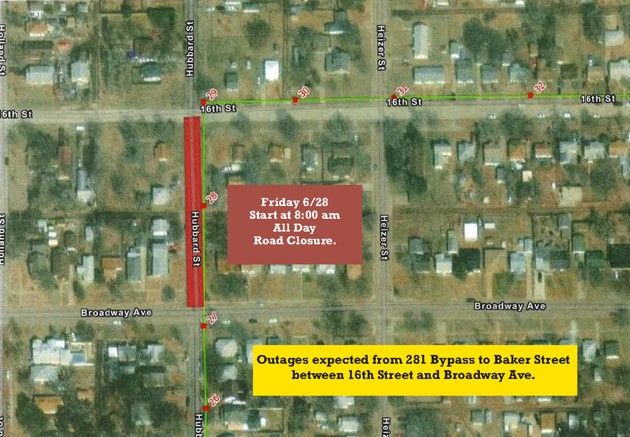 A short outage is expected on Friday, June 28, potentially up to four hours, and extends from 281 Bypass to Baker St., for residences between 16th St. and Broadway Ave. Operations crews will be notifying affected residents 24-48 hours in advance by traveling door to door and with front door hangers for residents who are away from home.