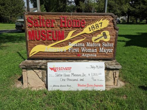Wheatland Electric Cooperative, Inc. today announced that its Sharing Success Fund, managed by the Scott Community Foundation, has awarded a $1,000 grant to the Salter House Museum. Located in Argonia, Kansas, the Salter House Museum was home to Mrs. Susanna Salter, America’s first elected woman mayor. The museum preserves the historic home and the artifacts within it, as well as the history of Argonia, while honoring the life of Mrs. Susanna Salter. The grant funds will be used to make roof repairs to help preserve the artifacts within this one-of-a-kind historic site.