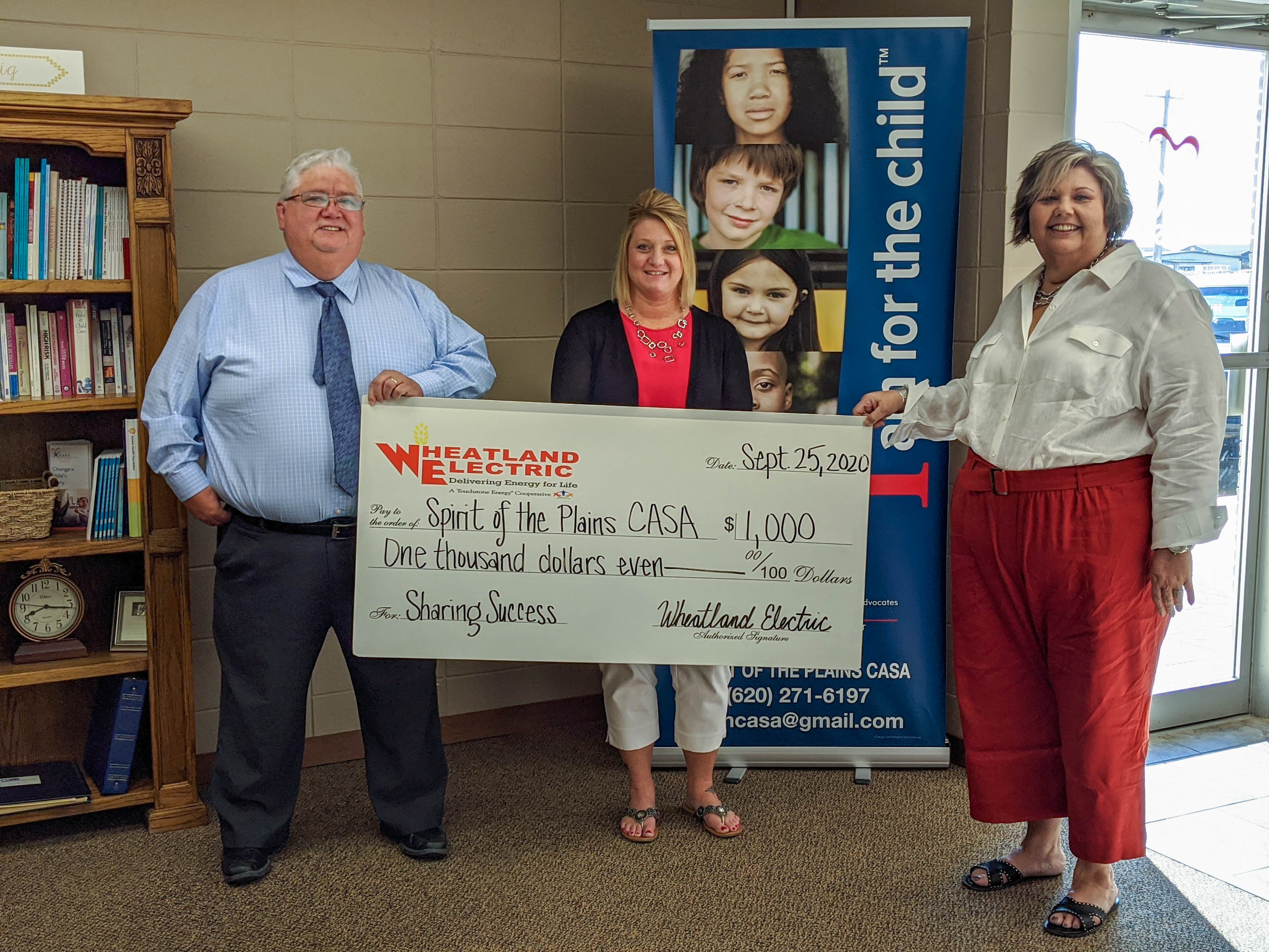 SCOTT CITY – Wheatland Electric Cooperative, Inc. announced today that its Sharing Success Fund, managed by the Scott Community Foundation, has awarded a $1,000 grant to Spirit of the Plains, CASA, Inc., based in Garden City. These funds will be used to recruit, train, and certify at least five to seven volunteers in Scott County, where a growing need for CASAs (court-appointed special advocates) exists.