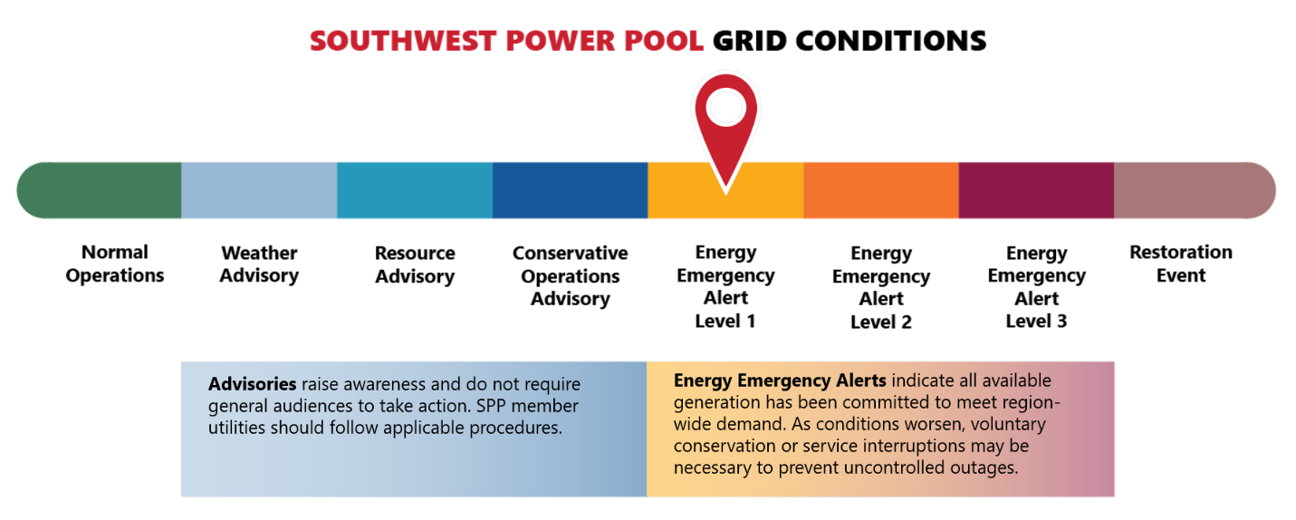 End-use customers in the SPP region should follow their local utilities’ instructions regarding the potential for outages, the need to conserve electricity or natural gas, and other steps to ensure their safety and the integrity of the regional grid.