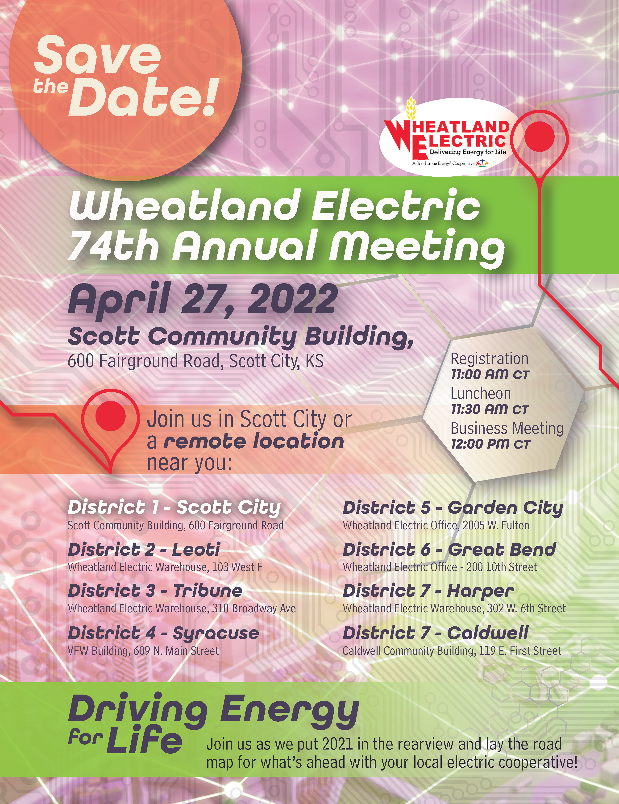 SCOTT CITY–The 74th Annual Meeting of the members of Wheatland Electric Cooperative, Inc. will be held Wednesday, April 27, 2022, at the Scott Community Building at 600 Fairground Rd., in Scott City, Kansas, and in seven other remote viewing locations across our service territory: Leoti, Tribune, Syracuse, Garden City, Great Bend, Harper, and Caldwell.