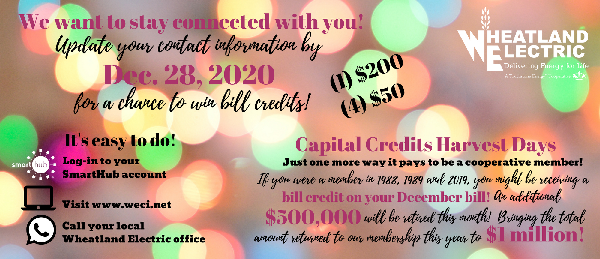 You can update your information at https://www.weci.net/capital-credits, by logging in to your SmartHub account, or by calling your local Wheatland Electric office by Dec. 28, 2020. Five lucky members will receive our bill credits, just for ensuring that we have your correct information on file!